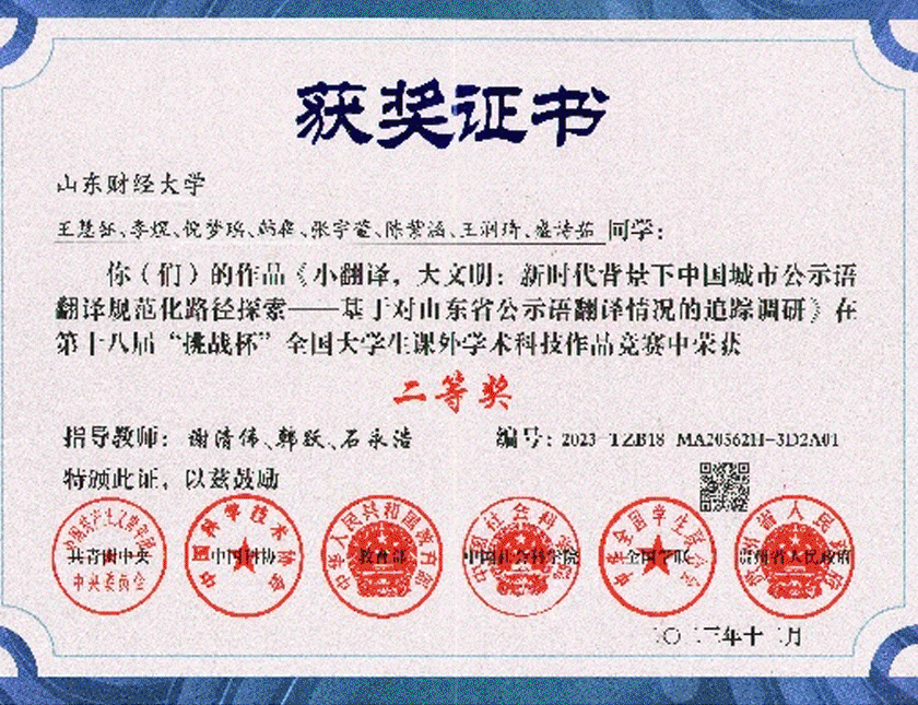 知行合一重实践,赛教融合见实效。近年,研究生参加高层次学术会议50余人次、宣读论文15人次,在《外国语》《外语教学与研究》等国内外知名期刊上发表了20余篇高质量论文。学生积极投身社会服务,承担联合国文件翻译等多项国际公益项目,以及省外办、文旅局、自贸区等30余项语言服务项目,推动学研产用深度融合。在“国才杯”“CATTI杯”“挑战杯”各类学科、创新创业赛事中,获国家级奖项69人次、省级奖项120人次,展现出优秀的综合素养和创新实力。