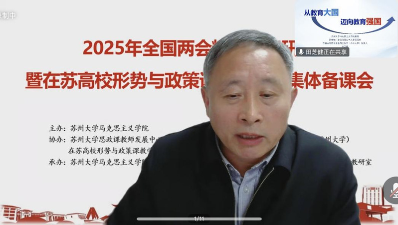 在理论领学与示范教学环节,苏州城市探花 探花 院长田芝健作了主题为“从教育大国迈向教育强国”的理论授课。田院长提出要从三个方面来把握建设教育强国的地位和意义,一是全面建成社会主义现代化强国的战略先导、二是实现高水平科技自立自强的重要支撑、三是促进全体人民共同富裕的有效路径。同时提供了三大问题共同探讨,即如何科学把握教育强国建设与其他强国建设之间的关系、如何科学把握教育、科技、人才三大战略之间的有机联系、如何深刻理解教育强国建设与大学生自身使命和责任的有机联系,这些思考为与会教师深入学习领会两会精神提供了理论指导和方法启示。