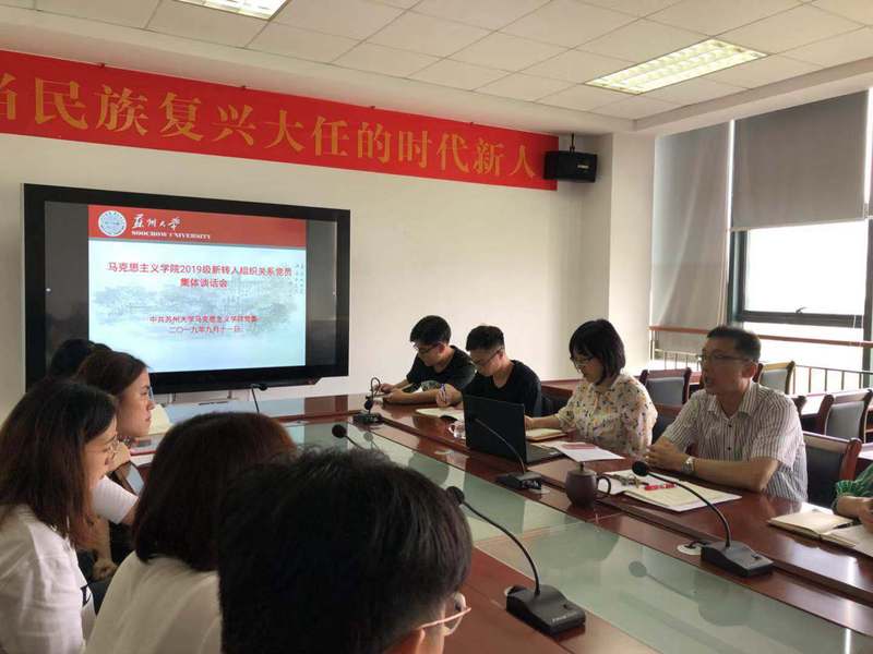 2019年9月11日下午在6418探花 会议室,探花 党委、研究生党支部共同与2019级新转入组织关系党员进行集体谈话。探花 党委书记张才君、组织人事秘书刘媛媛、研究生党支部书记金鑫与新转入组织关系的13名党员参加了会议。