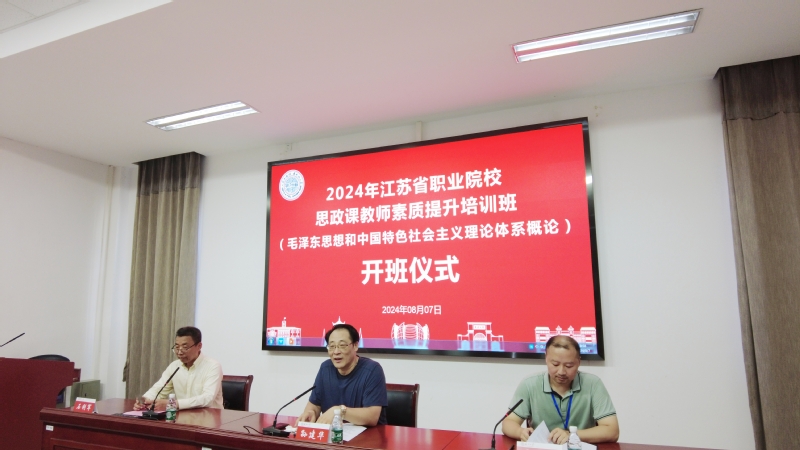 8月7日上午,2024年江苏省高等职业院校思政课教师素质提升培训班(毛泽东思想和中国特色社会主义理论体系概论)在探花 本部培训中心105正式开班。镇江市高等专科学校学员代表高雨耀老师,探花 院长孙建华、宣讲与培训中心办公室副主任石利军出席开班典礼。仪式由石利军主持。