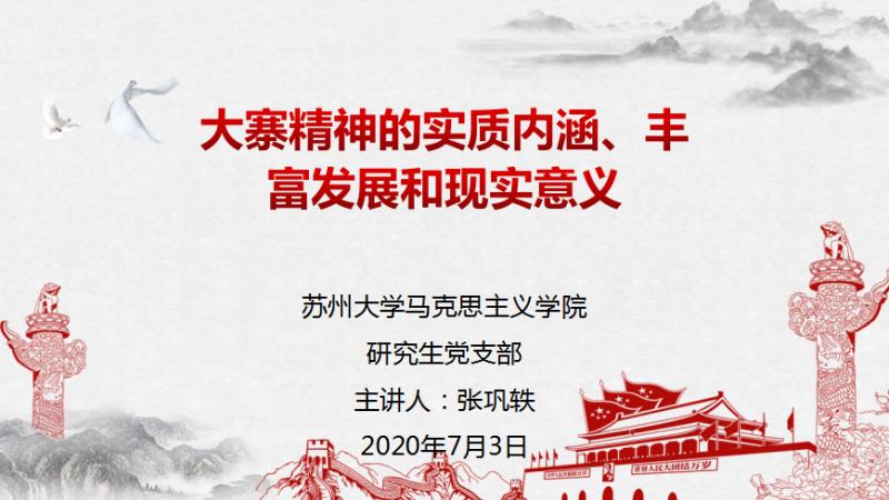 习近平总书记指出,中国精神是凝心聚力的兴国之魂、强国之魂。以爱国主义为核心的民族精神和以改革创新为核心的时代精神交相辉映,为伟大的“中国精神”注入了崭新的时代元素。为庆祝党的99周岁生日,进一步引导广大党员同志深入学习贯彻“中国精神”,探花 研究生党支部于7月3日特别举办主题为“学习中国精神,牢记初心使命”的线上微党课学习活动。学习活动由探花 研究生党支部宣传委员毛瑞康主持,支部委员会委员、各年级党小组组长及党员代表参加学习活动。