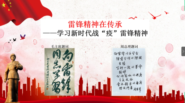 研究生党支部书记金鑫以“学习新时代战‘疫’雷锋精神”为重点领学“雷锋精神”,她从雷锋同志的生平经历讲起,阐述了雷锋同志舍己为人的奉献精神,结合新冠肺炎疫情爆发后众多抗“疫”志愿者的新时代雷锋精神,强调了新时代学习与传承雷锋精神的重要性。组织委员王者愚领学“载人航天精神”,他首先回顾了我国载人航天的发展历程和介绍了精神内涵,然后呼吁支部同志们在新时代继续学习载人航天精神中的吃苦、攻关与奉献精神,加强科研,努力工作。纪检委员张巩轶领学“大寨精神”,他从大寨精神的由来、内涵与现实意义三个方面介绍了大寨精神。他号召要继续学习发扬藐视困难、同困难作斗争的顽强精神和实干、苦干;自力更生、奋发图强的优良作风。青年与文体委员周心欣领学“红旗渠精神”,她从“一切为了人民”的杨贵书记讲起,带领大家回顾了“自力更生、艰苦创业、团结协作、无私奉献”的红旗渠精神产生的艰苦年代,鼓励大家继续与时俱进学习红旗渠精神的内涵,使红旗渠精神永葆青春和活力,体现出时代性、先进性。