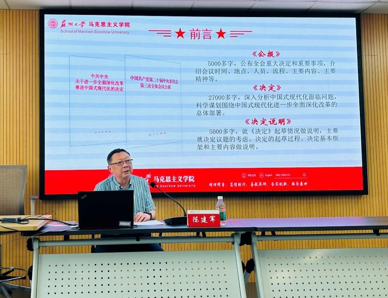随后,陈建军书记以“深刻认识党的二十届三中全会的重大意义”为题为学员进行第一次培训授课。他从三个方面解读了党的二十届三中全会的重大意义。首先,详细介绍了党的二十届三中全会的有关情况及所取得的重要成果,使学员们对这次会议有了清晰的认识和把握;而后,深入剖析了党的二十届三中全会的重大意义,强调了其在新时代中国特色社会主义事业中的历史地位和作用;最后,聚焦于新时代全面深化改革的重点任务,结合习近平总书记的新观点、新思想、新论断,为学员们描绘了改革蓝图,指明了前进方向。在讲授过程中陈建军书记特别指出,党的二十届三中全会既是党的十八届三中全会以来全面深化改革的实践续篇,也是新征程推进中国式现代化的时代新篇,它不仅是对过往经验的总结与升华,更是对未来发展的规划与部署。最后,陈建军书记希望大家能够以本次学习培训为契机,结合个人自学等多种学习方式,深入领悟党的二十届三中全会精神,在接下来的学习生活中,不断锤炼自己的党性修养和综合素质,努力成为新时代合格的中国共产党党员,争做优秀的社会栋梁。