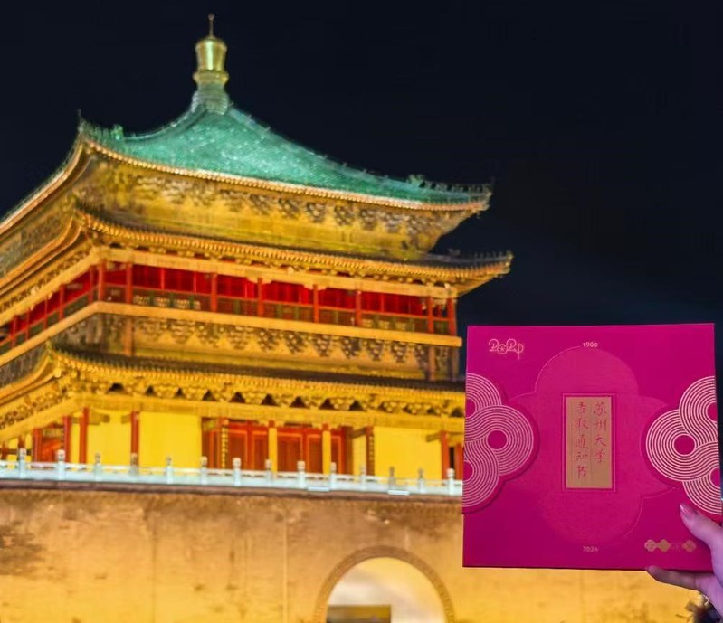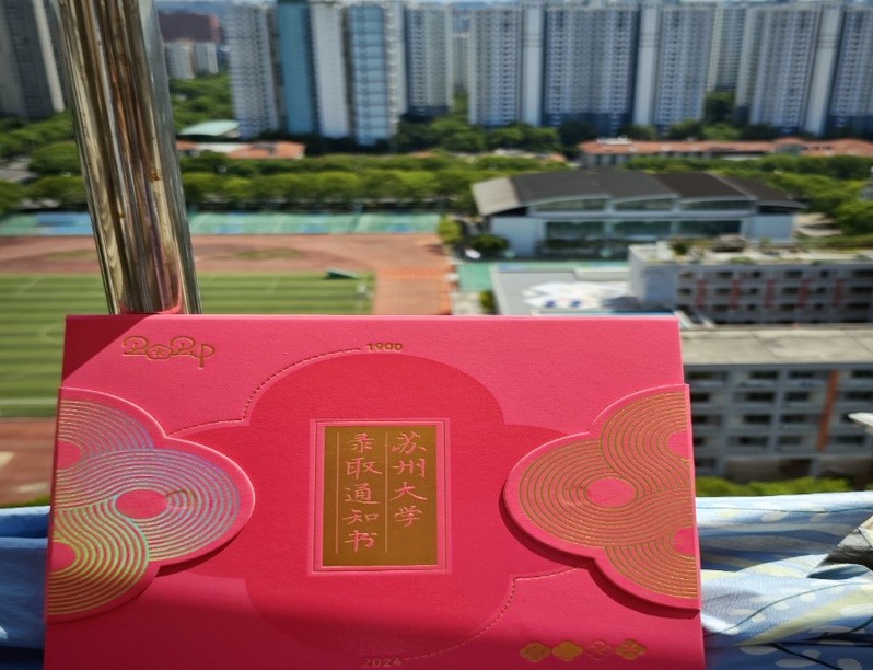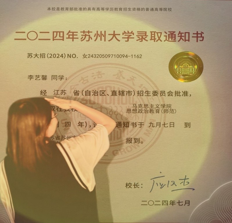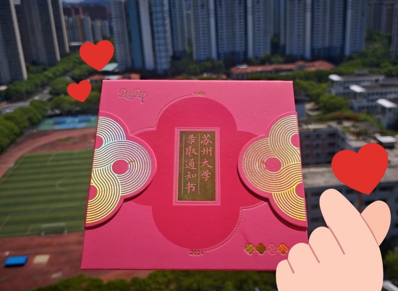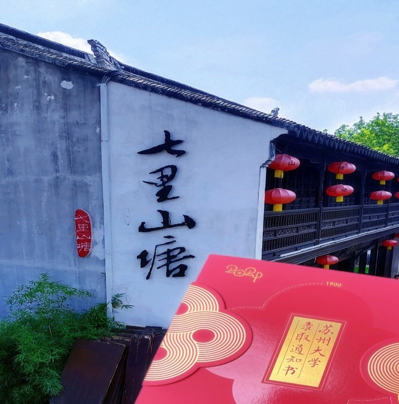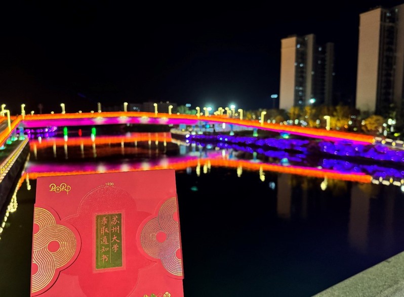 百越天:这封录取通知书的背后,便是我的家乡泰州姜堰的新地标——三水之环步行桥。通知书的一抹粉红与流光溢彩的小桥相映成趣,桥梁背后的意蕴也和我的大学生活不谋而合。“三水”意为古时淮水、长江、黄海在此汇聚,孕育了独特的里下河文化;在马院,来自五湖四海的同学们相聚一堂,在学海中碰撞出灿烂的火花。“环”意味着连接、团结,希望未来在苏大的日子也能够和谐美好、一路繁花!