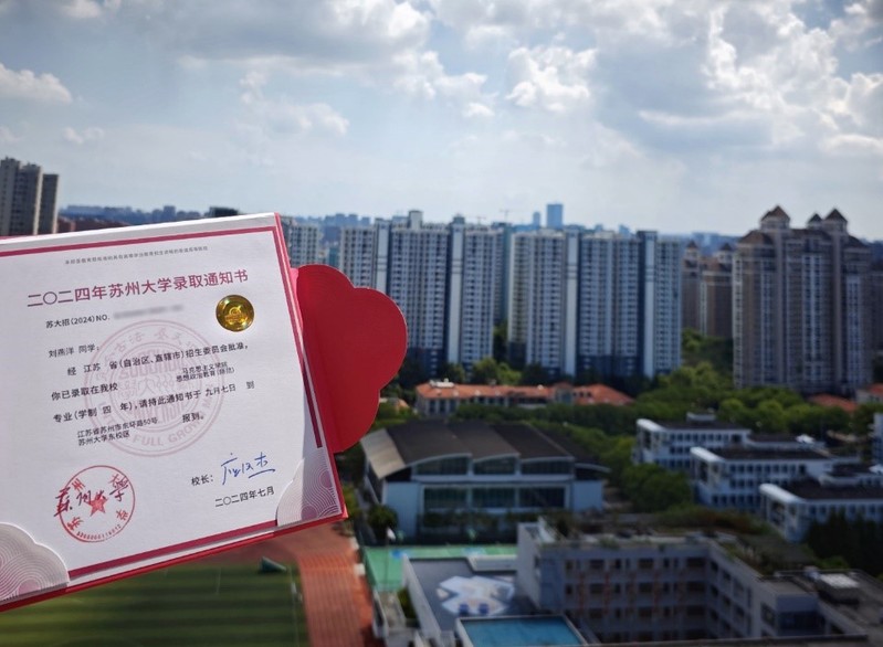 刘燕洋:在天台上将录取通知书和高中的母校合影,照片拍下的那一瞬间,我的心中充满万千感慨。上高中时,我常来天台散心,享受阳光、欣赏晚霞、仰望繁星。这片天台就像是独属于我的记忆盒子,承载着我的许多回忆。当我带着录取通知书来到天台,当苏大的怀抱与高中母校的背影重合,阳光洒下,而我身处其中,我想这便是努力与梦想的具象化。