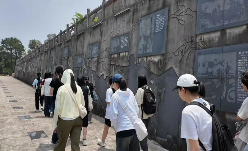在沉浸式教学体验环节,学生们在大金山国防园工作人员的引导下,重走长征路,参观了抗战文化纪念墙、抗战遗址碉堡、军事文化体验园及党史国史馆。在参观抗战纪念文化墙环节中,学生们通过“抗战军魂”“实业救国”“不屈呼声”“众志成城”“国际友人”的系列展示,了解了在抗日民族统一战线旗帜号召下,全体中华儿女同仇敌忾、奋起抗战的感人故事,深刻理解全民族抗战是中国人民抗日战争胜利的重要法宝。