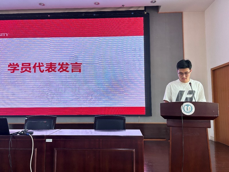 在结业典礼环节,2023级硕士研究生连雄飞作为学员代表发言。他分享了三点学习感悟:第一,要明理修身,笃行不怠,不断学习、拥护、宣传党的创新理论,不仅要在组织上入党,更要在思想和行动上入党;第二,要敢作敢为,善作善成,以坚定的理想信念为引领,勇于担当时代赋予的使命和重任;第三,要谦虚谨慎、戒骄戒躁,时刻保持思想的纯洁,品行的纯良、志向的纯真。