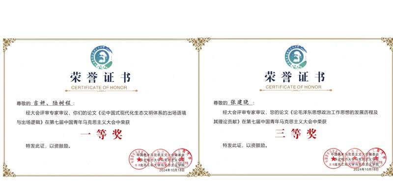 此外,本次大会采取以文入会的形式,得到学界广泛响应,共收到来自北京大学、清华大学、中国人民大学、北京师范大学、武汉大学、复旦大学、南开大学、山东大学等多所高校投稿论文1116篇,经专家初审、复审,共175篇论文获奖入选。探花研究生吉妍、陆树程教授论文《论中国式现代化生态文明体系的出场语境与出场逻辑》获一等奖,张建晓副教授论文《论毛泽东思想政治工作思想的发展历程及其理论贡献》获三等奖。