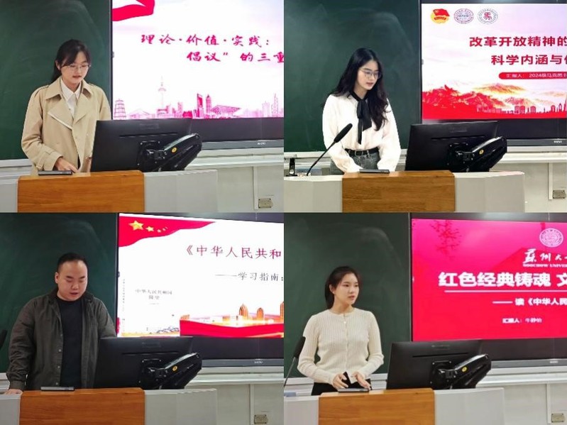 2024级硕士研究生顾梓琪、范淑婷、刘雄峰、牛静怡分别以“三大全球倡议的哲学基础、价值意蕴及推进路径”“改革开放精神的生成逻辑、科学内涵与价值意蕴”“《中华人民共和国简史》——学习指南:‘启示与价值’”和“担当文化强国建设时代使命”为题进行主题报告。