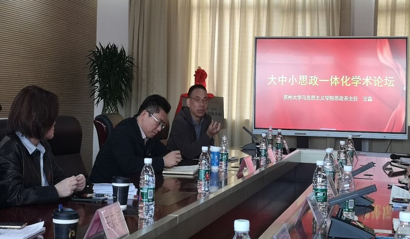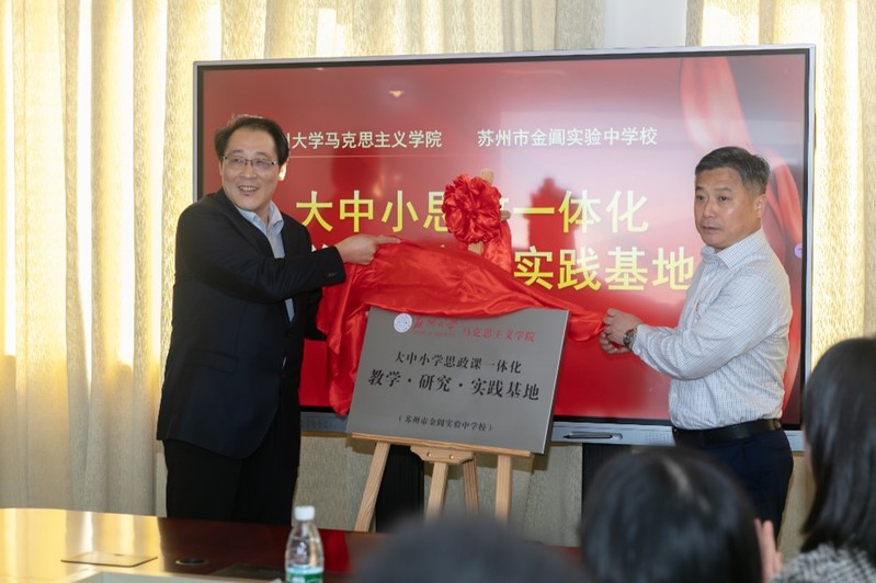 苏州市金阊实验中学校党总支书记陈荔主持了签约仪式,思政系主任王淼与金阊实验中学校校长杨喆毅签订了大中小学思政课一体化教学研究实践基地共建协议,孙建华院长与杨喆毅校长共同为“大中小学思政课一体化教学·研究·实践基地”揭牌。未来双方将依托各自的资源和平台优势推进实践教学体系、师资队伍建设、科学研究等方面的创新合作,持续推动大中小学思政课一体化实践工作。孙建华表示,希望通过双方的合作共建,把大中小学思政课一体化的工作做细做实,共同推动思想政治教育专业的人才培养、学科建设和科研工作。