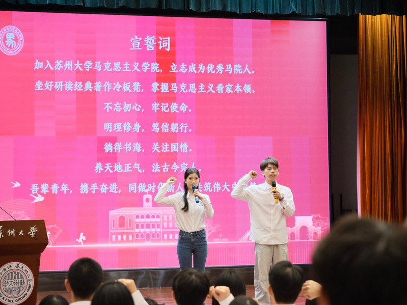 全体新生起立,高举右拳,齐声宣读入学誓词: