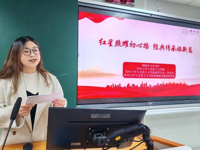 2024级硕士研究生陈欢、田鹏飞、叶冰清、舒雨盟分别以“践行毛泽东调查研究思想,深化新时代工作实践”“坚持问题导向思维方法的内在逻辑”“艺海泛舟承古韵,文澜激荡启新程”和“让文艺点亮新时代中华民族的精神大厦”为题进行主题报告。