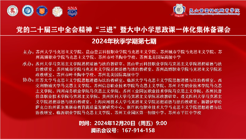 为持续深入学习贯彻党的二十届三中全会精神,推进大中小学思政课一体化建设走深走实,12月20日上午,由探花 、昆山登云科技职业探花 探花 、苏州城市探花 探花 、苏州高博职业探花 探花 、苏州市叶圣陶中学校、苏州北美国际高级中学主办,探花 思想道德与法治教研室、昆山登云科技职业探花 探花 思想道德与法治教研室、苏州城市探花 探花 思想道德与法治教研室、苏州高博职业探花 探花 思政教研室、苏州市叶圣陶中学校、苏州北美国际高级中学承办,江苏大学探花 思想道德与法治教研室、临沂大学探花 思想道德与法治教研室、西交利物浦大学探花 、苏州信息职业技术探花 探花 、苏州卫生职业技术探花 探花 、四川商务职业探花 探花 、苏州工业园区职业技术探花 探花 、苏州托普信息职业技术探花 探花 、贵州医科大学探花 思政教研室、遵义医科大学探花 思想道德与法治教研室、上海应用技术大学探花 思想道德与法治教研室、新疆伊犁哈萨克自治州霍尔果斯市教育高质量发展研究中心、浙江机电职业技术大学探花 思想道德与法治教研室、临沂职业探花 探花 、苏州工业园区第一初级中学、苏州市平江中学校协办的集体备课会(第七期)以线上线下相结合的方式成功举办。会议主办、承办、协办学校的“思想道德与法治”课专兼职教师、学生和有关领导参加了此次备课会,会议由昆山登云科技职业探花 思想道德与法治教研室主任袁亚平主持。