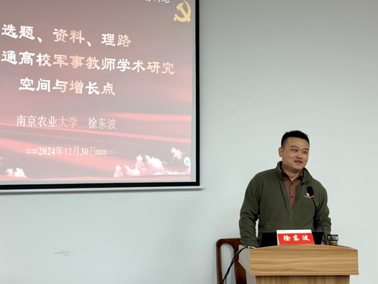 南京农业大学徐东波老师以《选题、资料、理路——普通高校军事教师学术研究的空间与增长点》为题,立足专业视角,深入剖析了学术研究过程中的关键要素,强调选题的时代性与创新性,内容的严谨性与逻辑性,并就学术论文发表提供了切实可行的建设性意见。