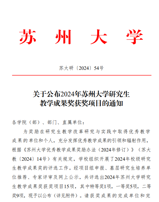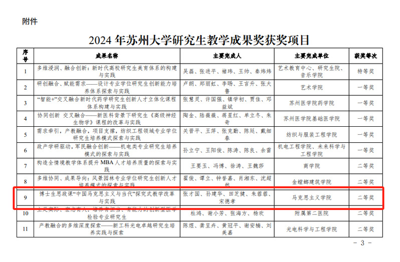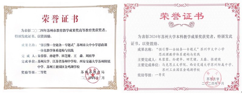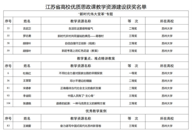 朱蓉蓉、孙建华、田芝健、王淼、张建晓老师申报的《“强引擎—全链条—专题式”苏州市大中小学思政课一体化教学体系建构与实践》获探花 本科教学成果一等奖、苏州市教育教学成果二等奖。近年来探花 持续探索大中小学思政课一体化的育人新思路,不断增强思政育人成效,该成果被《新华日报》等主流媒体报道。张才国、孙建华、田芝健、朱蓉蓉、宋德孝老师申报的博士生思政课《“中国马克思主义与当代”探究式教学改革与实践》获探花 研究生教学成果二等奖。