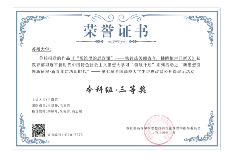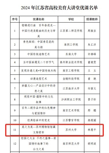 杜佩红、宋德孝、王慧莹、吉启卫、王晓蕾、罗志勇、胡绿叶、李金阳、张建晓老师在江苏省高校优质思政课教学资源建设中斩获一等奖1项、二等奖3项、三等奖6项,获奖数在全省名列前茅;林慧平老师的“美之为美——苏州博物馆馆藏文物赏析”入选江苏省高校美育大讲堂优课。近年来,探花 始终高度重视教学资源的培育遴选,努力打造优质思政课教学资源库,不断提高思政课教学的针对性和吸引力。