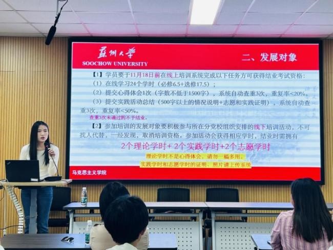 学生党员服务中心工作人员方晶晶同学细致讲解了学员守则和培训管理规定、理论学时、实践学时、志愿学时以及党课课程安排等相关事宜。