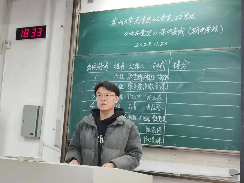 课内教学实践活动由课程班长李满森同学主持。李满森首先向同学们介绍了此次翻转课堂的新模式以及课堂汇报流程:教学活动由小组汇报、师生打分和师生点评三个环节构成。各组代表张佳辉、蔡吴清清、郭欣然、苗菁、陈梓璇、杨韵蕊、倪佳琦同学依次上台作交流汇报,分享本组课内实践成果,讲述和展示各组学习《中国共产党历史》课程的心得体会及研学成果。