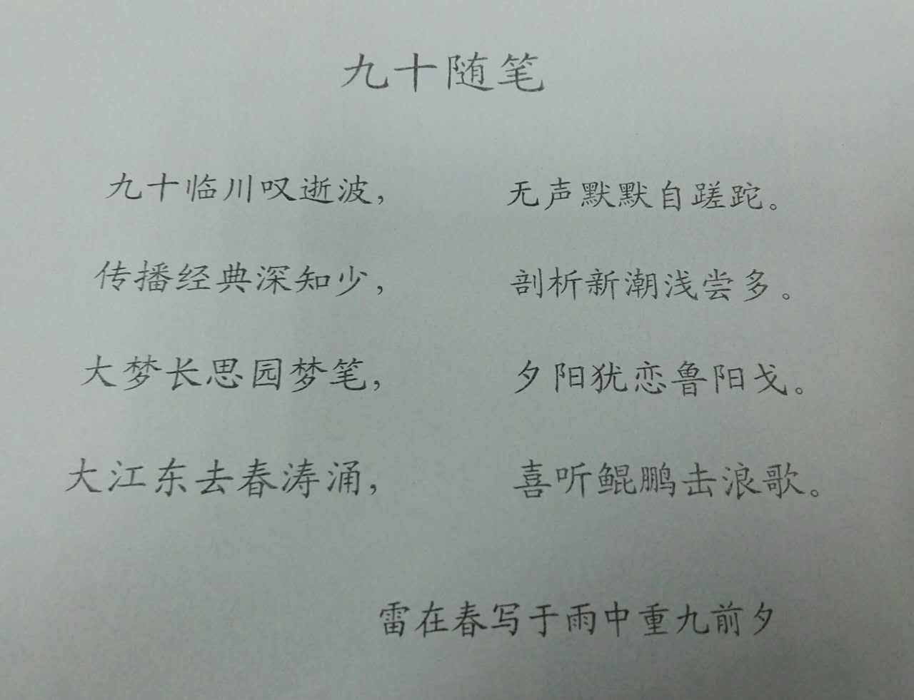 的各项发展工作中去。 寿星雷在春老师当场赋七律诗一首《九十随笔》: 九十临川叹世波,无声默默自蹉跎。 传播经典深知少,剖析新潮浅尝多。 大梦长思园梦笔,夕阳犹恋鲁阳戈。 大江东去春涛涌,喜听鲲鹏击浪歌。 寿星陈慰慈老师表示自己在文革后倍加珍惜为党工作的机会,心中始终有一个信念,就是党的任务必须不折不扣的完成,激励着自己在马列部的岗位上兢兢业业地坚守了十四年。 寿星王文钦老师通过解放前后小学、中学、大学的三个小故事,讲述了从一个孤儿成长为大学老师的经历,感悟出个人的命运是和祖国的命运连在一起的人生哲理。 寿星丁家钟老师回顾了上山下乡,恢复高考的历史变迁,说明我们的党完全有拨乱反正的领导能力,坚持改革开放以来所取得的成绩有目共睹,所以没有共产党就没有新中国是永远颠覆不破的真理,以前在课堂上就是这样理直气壮的告诉我们的学生。 老师的三尺讲台梦,就是希望看到自己的学生早日成为报效祖国的栋梁。最后,学生代表在寿星们的拳拳肺腑之言中深受启发,满怀着对老教师的尊敬和爱戴和两个探花