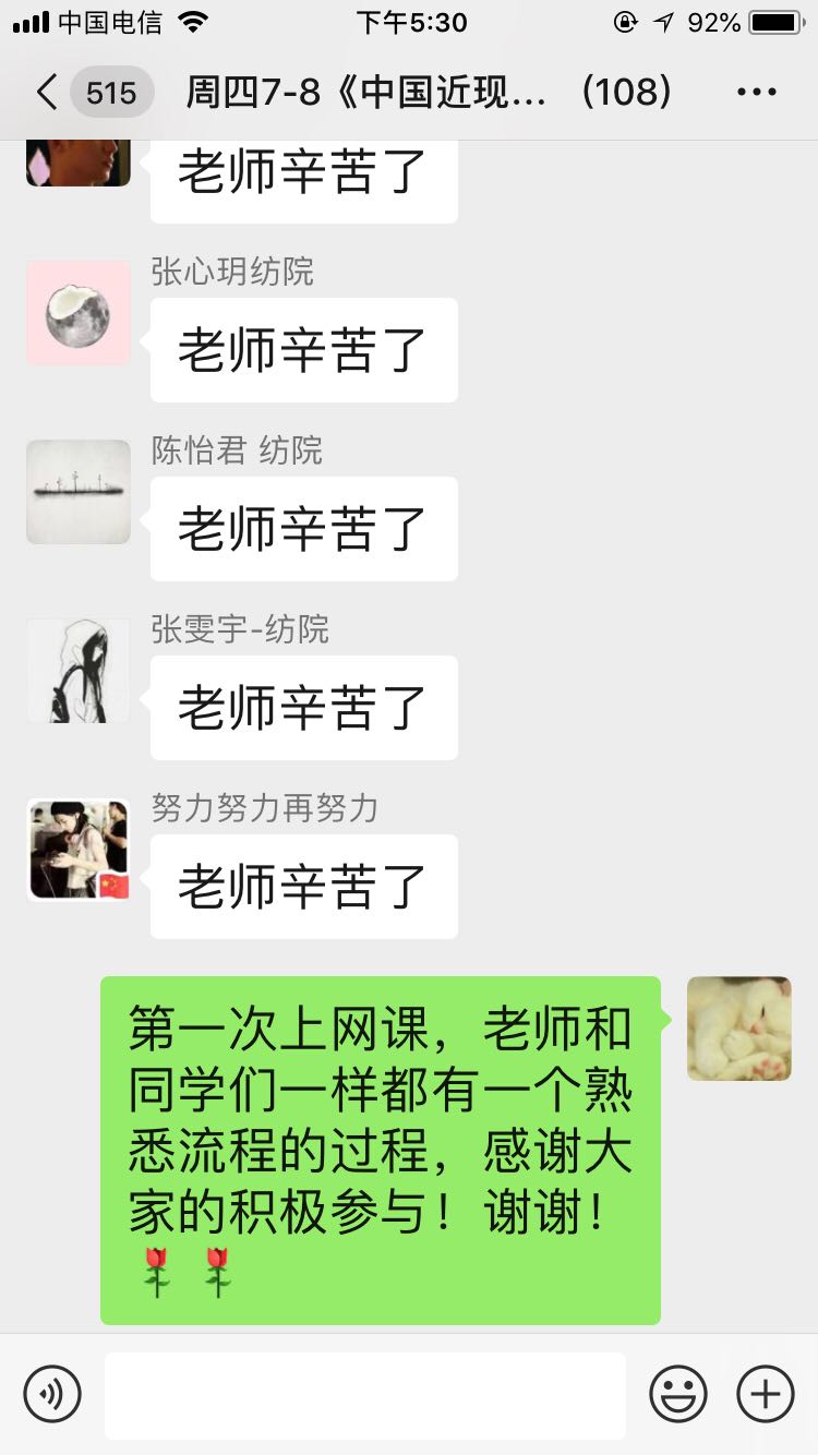 线上教学对于近现代史支部大部分拥有30余载教龄的老教师而言,是个巨大的挑战,更是创新教学模式、改进教学方法,实现教学互动与翻转教学的契机。全体教师变压力为动力,发扬“不辞辛劳,不畏艰难,不怕吃苦、不言放弃”的“四不”精神,认真准备,刻苦练习,不断测试与尝试,精心准备网络拥堵下的各种预案……终于赶在在2月24日线上教学开始前,学会了新技术,掌握了新本领。新学期第一周,老师们自信从容地走进了自己的直播间,当起了“网红主播”。从劳累紧张的网络直播间“见面课”中下来,老师们脸上流露着挑战自我的自信,洋溢出尝试全新教学方式带来的喜悦。眼见电脑屏幕跳动着学生赠送的一支支红玫瑰,耳闻同学们的暖心话语“我太爱了,这门课好有意思”、“老师辛苦了!”,这一刻,老师们的心头有无限感慨:之前的一切努力和付出,都值了!
