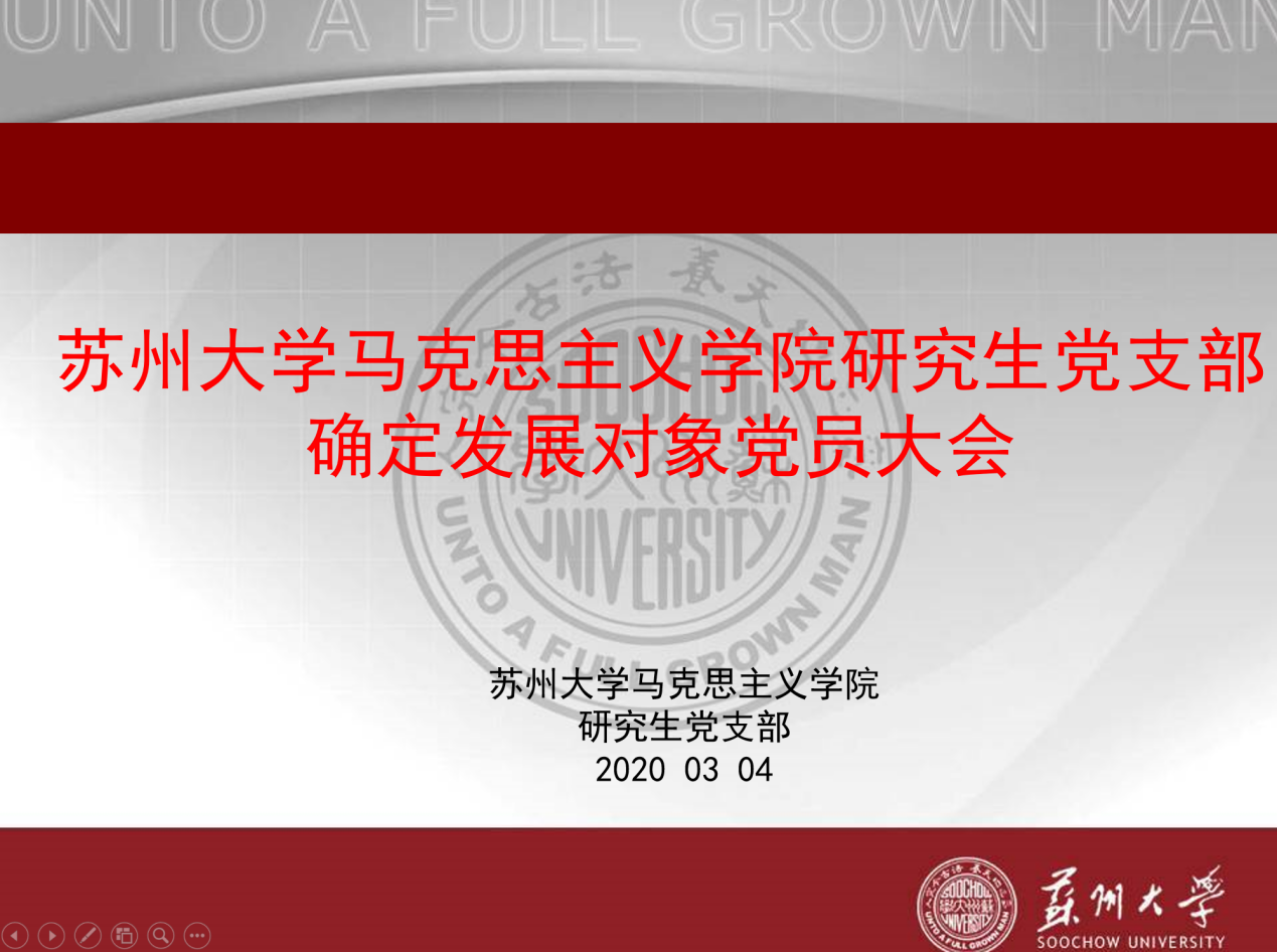 2020年3月4日上午10:00,关于确陈一铭、章咏芳、刘婉婉、杨璠四名同志为发展对象的线上视频党员大会在学习强国平台准时召开,本次大会应到45名党员,实到44名,符合开会要求。大会由研究生党支部书记金鑫同志主持,由王者愚同志做会议记录人。