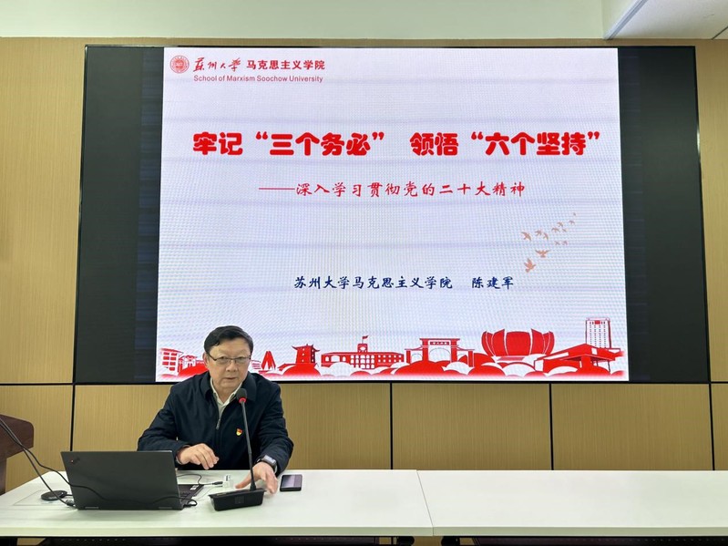 陈建军书记以“牢记‘三个务必’ 领悟‘六个坚持’——深入学习贯彻党的二十大精神”为主题,分别从牢记“三个务必”,坚定历史自信;深刻把握“三个务必”的丰富内涵;深刻把握“三个务必”的内在关系;深刻把握“三个务必”的重大意义和领悟“六个坚持”,实现新的飞跃等四个方面进行阐释,与学员们分享了学习党的二十大精神的心得体会。陈建军希望学员们认真学习习近平新时代中国特色社会主义思想,用党的创新理论武装头脑,指导实践,推动工作,务必牢记党的初心使命,坚持党的政治本色和优良传统,凝聚党的强大精神力量。