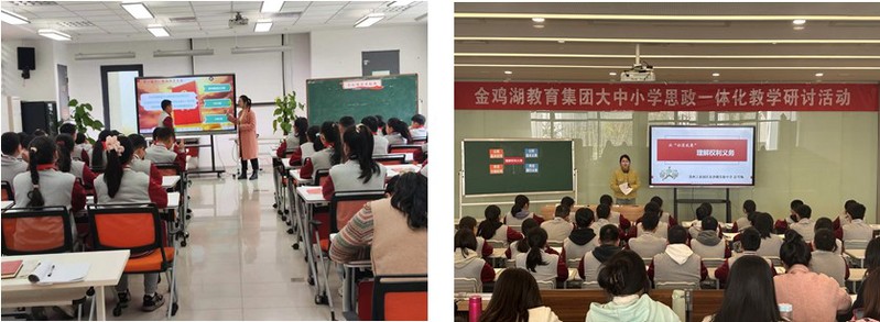 此次教学研讨活动围绕公民的基本权利主题展开,分为听课观摩、演课展示、交流研讨三个环节。星洋学校王佩青老师在小学课堂围绕公民的基本权利主题,以社会热点事件、学生日常生活为课程切入点,向小学生们讲解权利的类别及权利的正当性,培养学生对公民基本权利及法律的正确认识和积极情感。东沙湖实验中学彭雪梅老师面向初二学生,在强调思想性、情感性的基础上,突出了思政课程的知识性和科学性,通过深入讲解权利的内涵及类别,结合现实案例,深化学生们对公民基本权利及相关内容的认识。