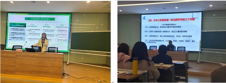 交流研讨环节,江苏省特级教师、苏州市教科院原副院长朱开群以自己的“实现人生价值”教学活动设计为案例,分析并讲解在大中小学思政一体化建设背景下,如何上好不同学段的思政课,在面对不同背景、不同年龄的学生时,如何选取教育资源并进行再加工、再设计。大家围绕教学主题,分享了听课观摩感受,提出了教学优化的合理建议,为不同学段的思政课教师相互借鉴提供了有益经验。