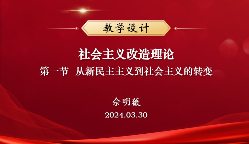 佘明薇老师从学情分析、教学目标、教学重点和难点、教学方法、教学过程、教学总结和反思等方面进行了分享。佘老师依据教育部统编教材和课件,辅以马克思主义经典作家相关理论和生动案例,从中华人民共和国成立初期国内形势导入课程,着重从“新民主主义社会的过渡性”“新民主主义社会向社会主义社会过渡的现实依据”“新民主主义社会向社会主义社会过渡的理论依据”三个方面阐述了对新民主主义社会的特性以及社会主义改造理论形成的社会历史背景与学理根基。通过详实的讲解让学生懂得我国实现从新民主主义向社会主义的转变、走社会主义建设道路是历史和人民的选择,社会主义改造理论是马克思主义基本原理与中国实际相结合的重大成果。