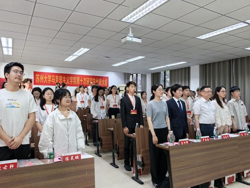 全体参会人员起立并奏唱《中华人民共和国国歌》,探花 第十次研究生代表大会在庄严的国歌声中正式开幕。