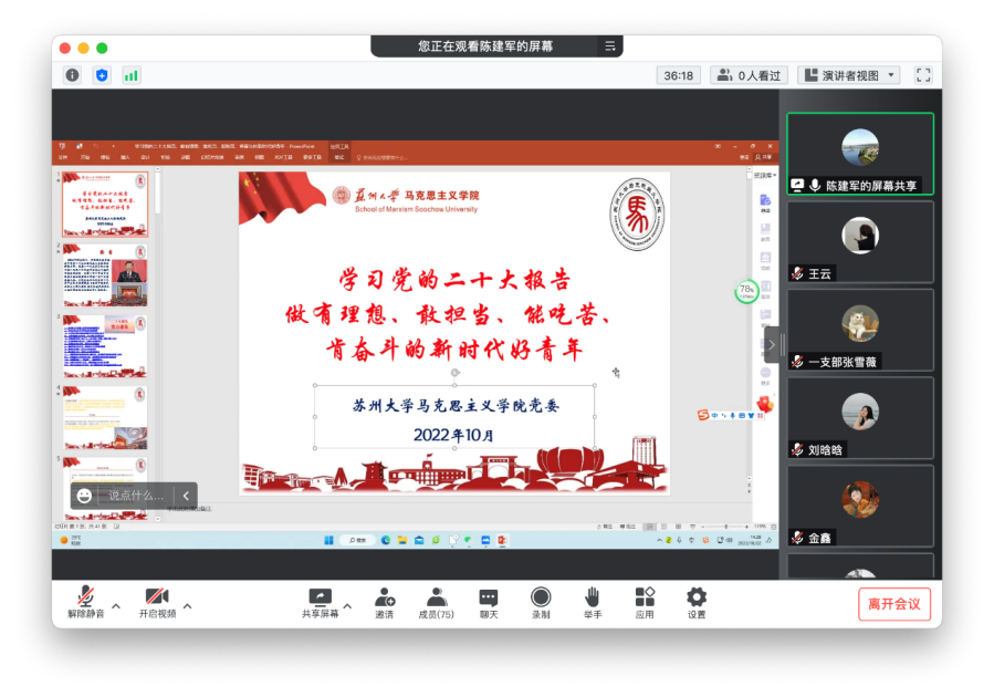陈建军书记为全体学员和2022级新生党员讲授专题党课。他以“学习党的二十大报告 做有理想、敢担当、能吃苦、肯奋斗的新时代好青年”为题展开授课。陈书记首先梳理了党的二十大报告中提出的十五个要点,具体阐解释了中国式现代化的五个特色和本质要求、全面建设社会主义现代化国家的内在要求和战略要求等要点。陈书记强调,各位学员要树立崇高的理想信念和正确的奋斗目标,拥有奉献精神,全心全意办好事、干实事,在各方面发挥先锋模范作用。最后,他希望各位学员以能够加入中国共产党为傲,时刻牢记党员身份,自觉弘扬优良传统,践行强国目标。