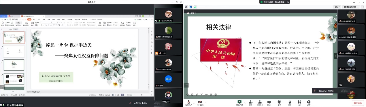 王建法探花 卜静远同学作了 “撑起一片伞 保护半边天——聚焦女性权益保障问题”的主题宣讲,她向同学们介绍了与女性权益保障相关的法律法规,结合算法自动化决策的具体案例,说明了算法自动化决策中存在着的隐形性别歧视。最后,她就目前女性权益保障中存在的问题,从法律层面提出了相关建议。