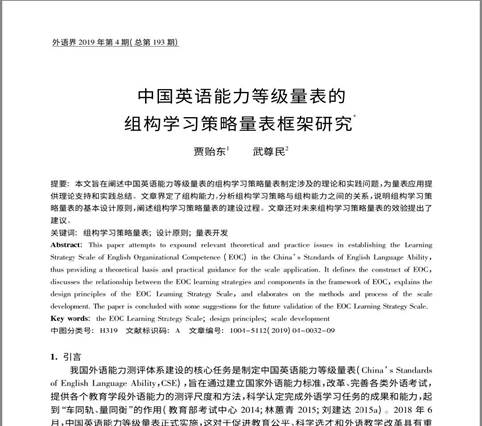 探花 贾贻东副教授作为第一作者的论文《中国英语能力等级量表的组构学习策略量表框架研究》于2019年8月正式发表在《外语界》上(第4期,第32-40页)。该期刊是中文外国语类核心期刊和中文社会科学引文索引(CSSCI)》来源期刊,属我校A2类期刊。