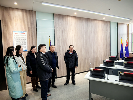 栗献忠教授在学院领导班子成员的陪同下,实地考察了各专业教研室、资料室、智慧翻译数字实训室、同声传译实验室、商务英语实践实验室等,对学院办公办学条件和学生学习条件有了充分的了解。