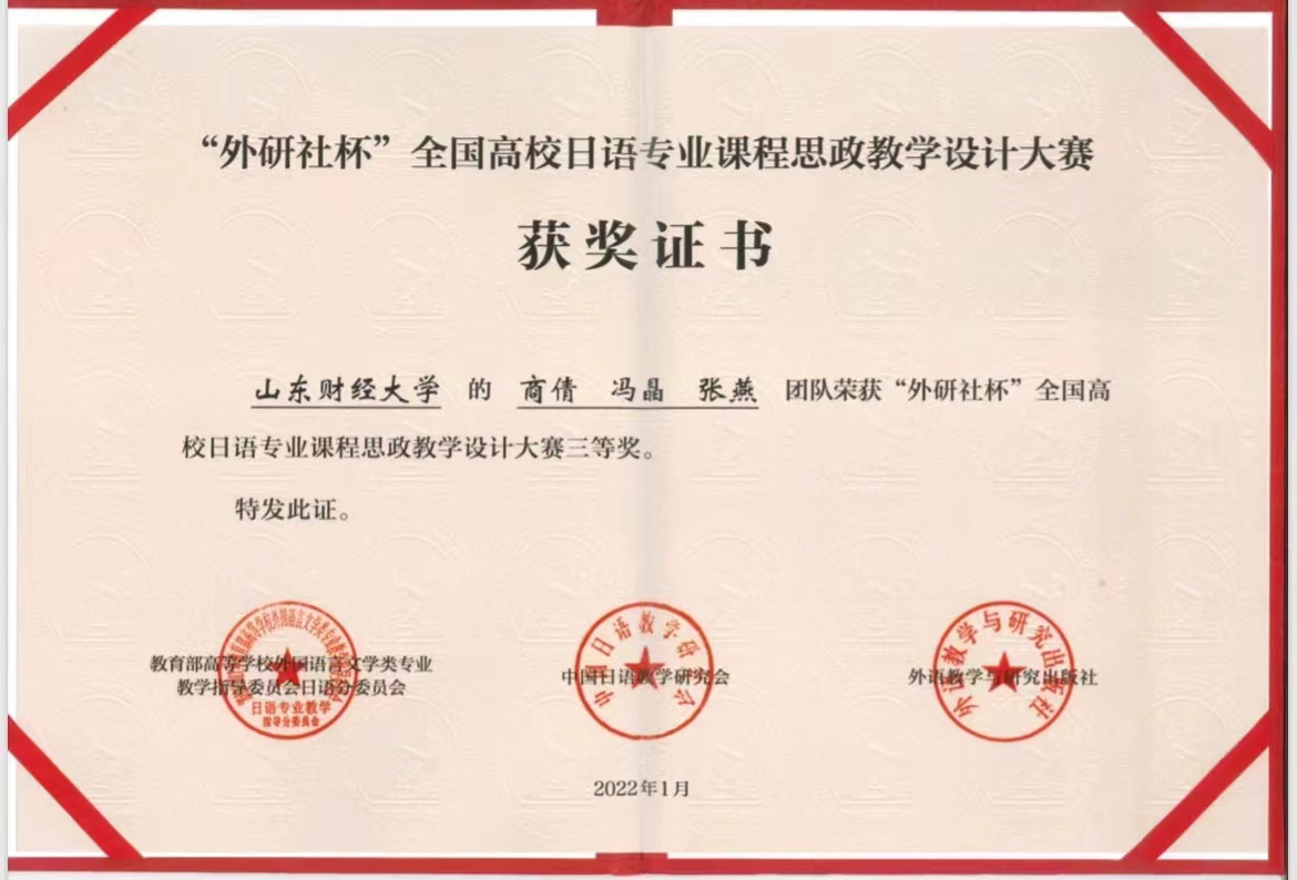 “外研社“杯全国高校日语专业课程思政教学设计大赛由教育部高等学校外国语言文学类专业教学指导委员会日语分委员会、中国日语教学研究会和外研社共同主办,旨在贯彻落实教育部《高等学校课程思政建设指导纲要》的精神和要求,加快实现高等教育立德树人的根本任务,促进日语专业核心课程思政建设,推动全国专业日语教育改革。日语系由商倩、冯晶、张燕3名教师组成的团队积极备战,为实现专业课程与思想政治理论课程同向同行,深入挖掘教学思政的融入点,在教案设计、教师说课、教学展示3个环节中集思广益、反复打磨,充分展现了探花 日语专业教师的教学水平和精神风貌。