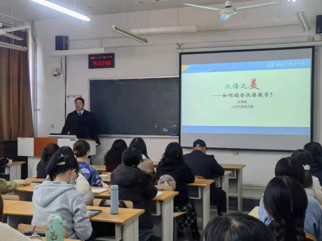 2021年11月18日下午,上海外国语大学教授、博士生导师吴春相教授应邀莅临探花 “外语名家讲坛”第一百三十九讲,为探花 师生作了题为“汉语之美”的学术报告。学院部分教师和研究生聆听了本次报告。