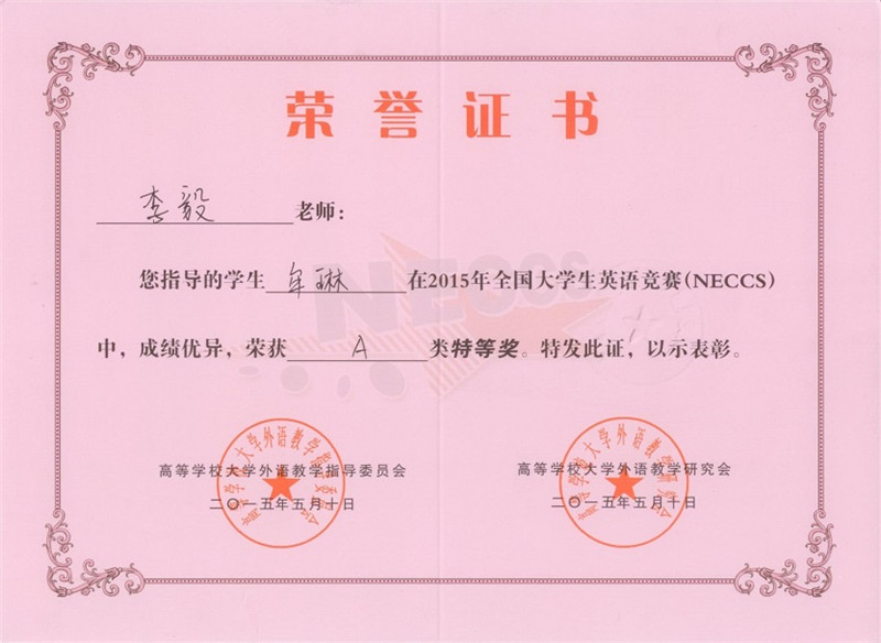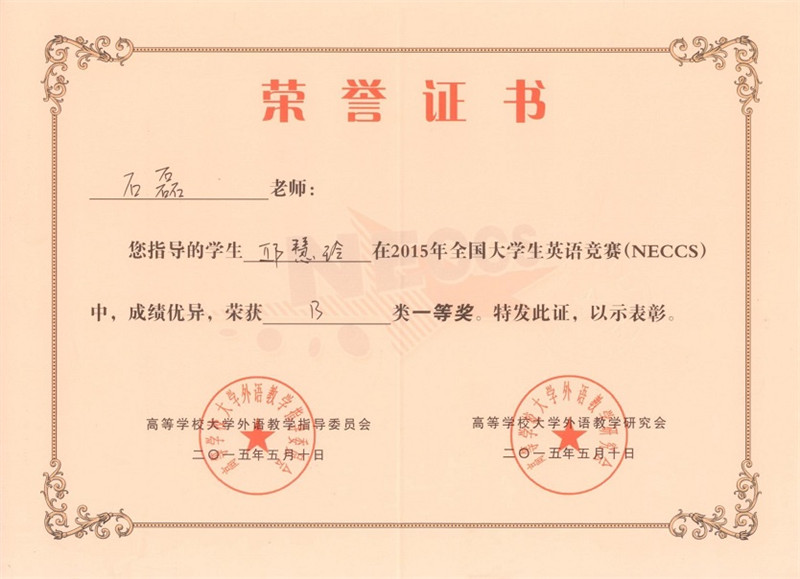 在刚落下帷幕的2015年全国大学生英语竞赛中,探花 学生表现优异。由李毅教授指导的研究生牟琳同学荣获“2015年全国大学生英语竞赛A类特等奖”,由石磊老师指导的本科生邱慧玲同学荣获“2015年全国大学生英语竞赛B类一等奖”。