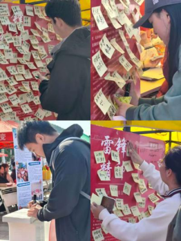 “语传志愿情,锋行暖校园”主题打卡墙成为现场温暖亮色,师生提笔书写对雷锋精神的理解、对志愿事业的期许,一张张便利贴汇聚满墙温情,不少师生合影定格春日追“锋”瞬间。工作人员悉心维护打卡墙,耐心解答志愿招募疑问,让志愿的种子在此悄然播撒。