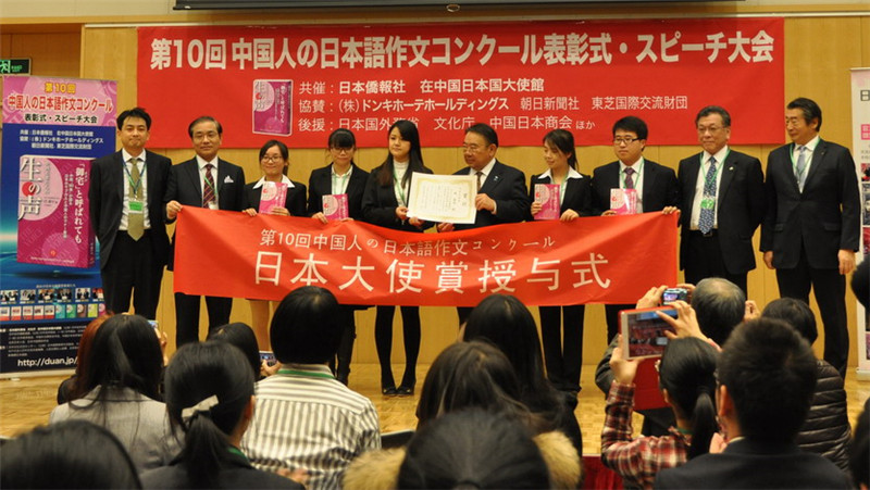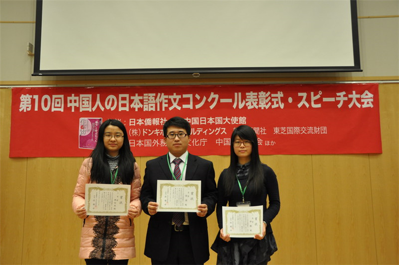 12月12日,由日本侨报社和日中交流研究所共同主办的第十届全国日语作文大赛颁奖仪式在日本大使馆隆重举行。本次大赛共有来自全国196所院校的4133人参赛,参赛人数创历史新高,竞争空前激烈,探花 学生的获奖人数在全国各参赛高校中名列榜首。日语专业2012级的陈谦同学获得一等奖,日本驻华大使木寺昌人亲自向其颁发了奖状和奖品。2012级的姚怡然、2011级的申皓获得三等奖。获奖同学在日语专业副主任冯晶副教授和外教新村美有纪的带领下,参加了颁奖仪式。颁奖嘉宾有日本驻华大使木寺昌人,北京日本学研究中心主任、中国日语教学研究会会长徐一平以及来自东芝株式会社、中国日本商会等知名企业界的代表。日本朝日新闻、NHK等各大媒体全程报道。