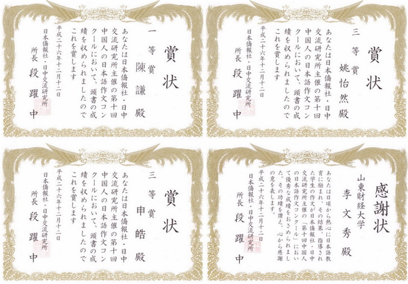 作为我校首届外语技能系列大赛的一个环节,探花 日语专业于今年5月组织了日语写作大赛,赛后安排教师对优秀学生进行了精心指导,并推荐参加了国内日语界规模、影响最大的赛事之一--“第十届全国日语作文大赛”。本次大赛以“ACG(动画、漫画、游戏)和我”、“公共礼仪与中国人”为主题,历时5个月,经过4轮严格的评审,最终评选出特等奖1名,一等奖5名,二等奖15名,三等奖40名。另外,陈谦和姚怡然同学的指导教师新村和申皓同学的指导教师李文秀获得了主办方颁发的“感谢状”,新村还被委托为新一届作文大赛的“推广大使”。