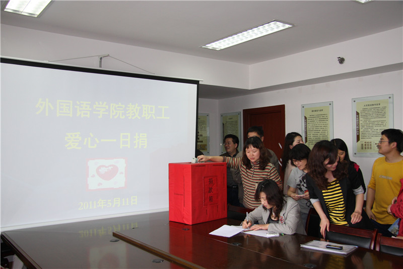 2011年5月11日下午,在国际交流中心601会议室,探花 积极响应省教育厅、省教育工会、省教育基金会“爱心一日捐”活动(鲁教财字[2011]10号文件)的统一部署和高校工委、山东省慈善总会高校分会“关于进一步做好高校慈善工作的通知”(鲁高工委通字[2011]33号)要求,学院领导高度重视,由副书记汤长胜传达了爱心日捐通知。随后,学院全体教职员工慷慨解囊,纷纷捐款,体现了关爱他人,大爱无疆的精神。共有66位教职工参加了此次日捐活动,共筹集善款7600元钱。