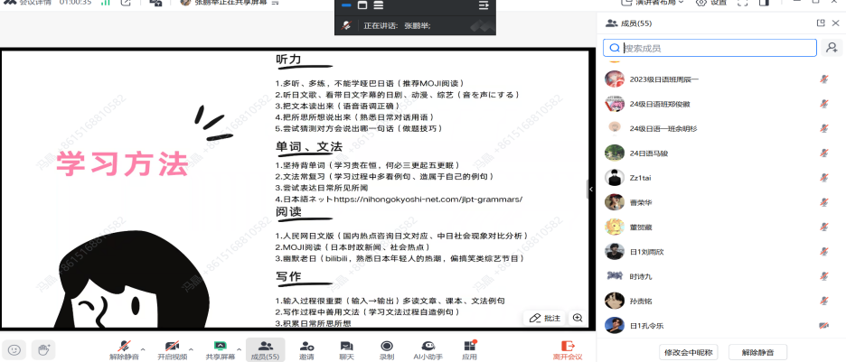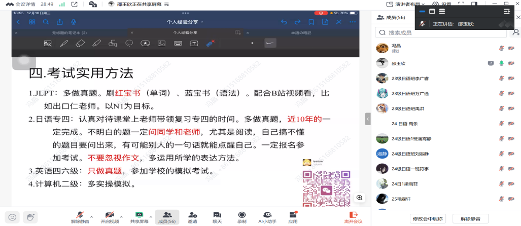 为帮助日语系学生营造互助共进的学习氛围,12月10日,探花 日语系于线上成功举办 “保研学生学习经验分享暨期末动员会”。2022级成功推免硕士研究生的邵玉欣同学和张鹏举同学分享了个人学习经验,活动由李宗玲老师主持,日语系教师代表及大一、大二、大三的全体学生参加了此次活动。
