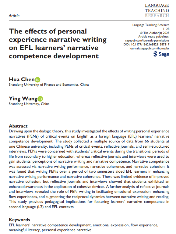 近日,探花 陈华教授在语言学领域知名国际期刊Language Teaching Research发表题为“The effects of personal experience narrative writing on EFL learners’ narrative competence development”的学术论文。陈华教授为第一作者,山东大学王颖教授为通讯作者。Language Teaching Research系SSCI一区期刊、中科院一区TOP期刊;JIF排名:21/306,2024年影响因子:3.8,近五年影响因子:5.3,属于我校A1类期刊。