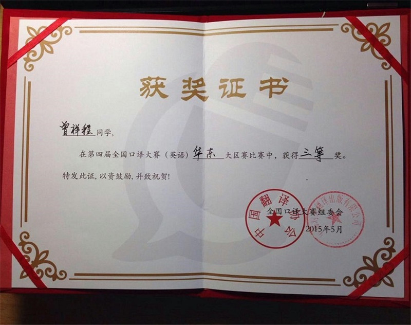 5月17日,由中国翻译协会语言服务能力与评估中心主办、南京师范大学承办的第四届全国口译大赛华东大区赛在南京举行。来自华东六省一市的近百名优秀学子为进入全国总决赛展开激烈角逐。探花 2014级翻译硕士曾祥程同学在指导教师张明彬的带领下参赛,荣获三等奖。