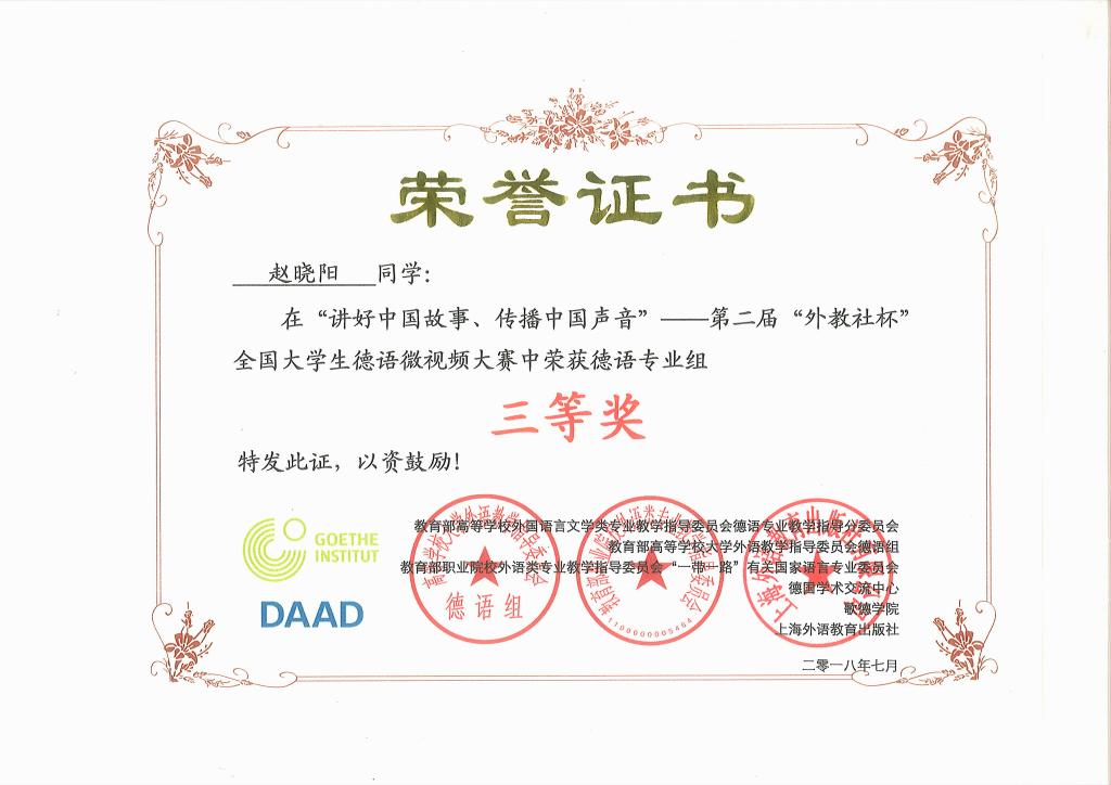 近日,由教育部高等学校外国语言文学类专业教学指导委员会德语专业教学指导分委员会、教育部高等学校大学外语教学指导委员会德语组、上海外语教育出版社、德意志学术交流中心以及歌德学院等联合举办第二届“外教社杯”全国大学生德语微视频大赛落下帷幕,探花 德语系2016级赵晓阳同学的作品《我的青岛》在德语专业组脱颖而出获三等奖。