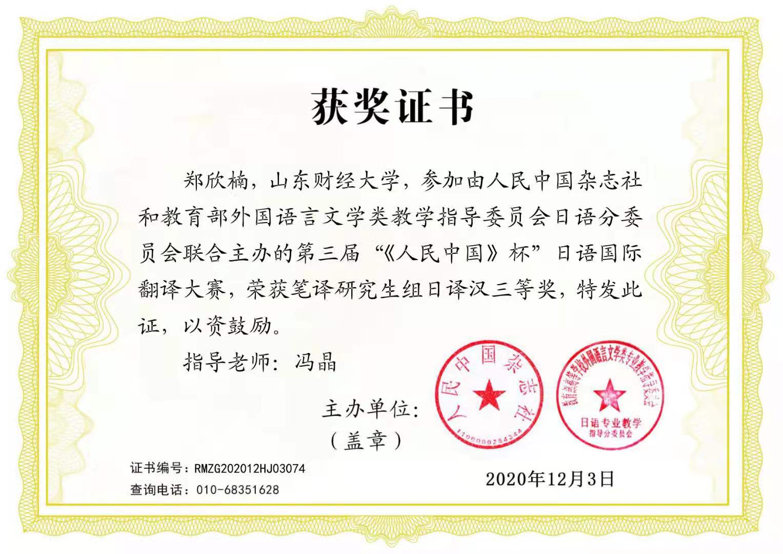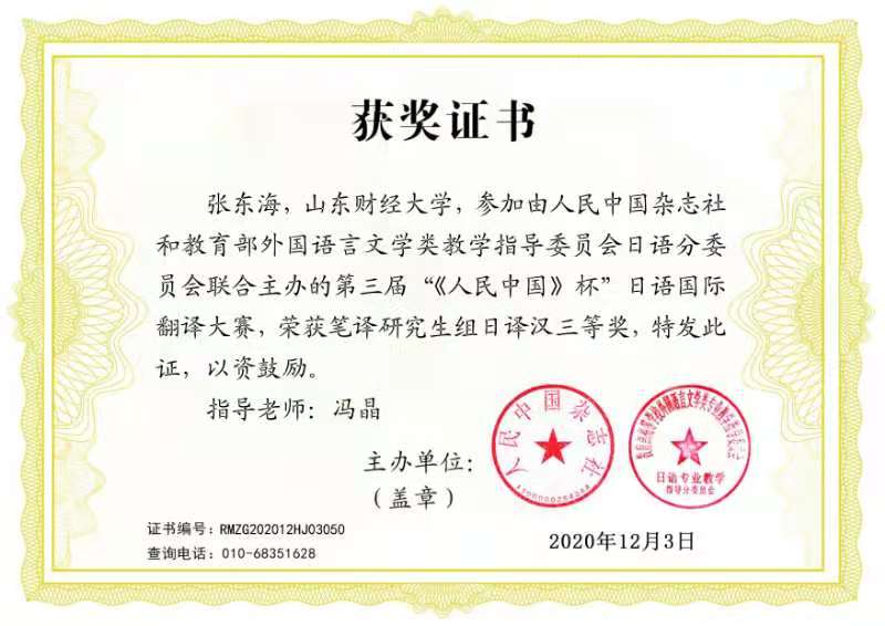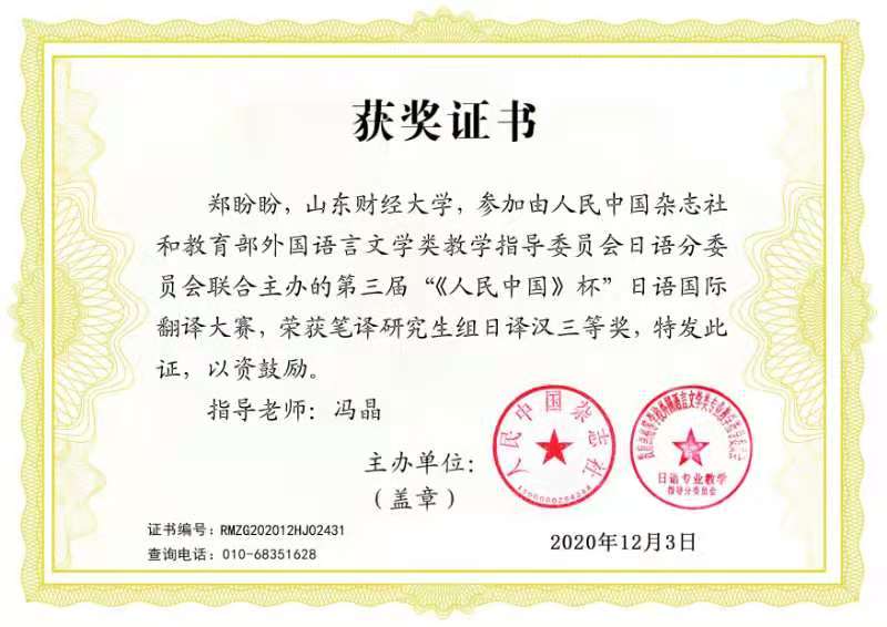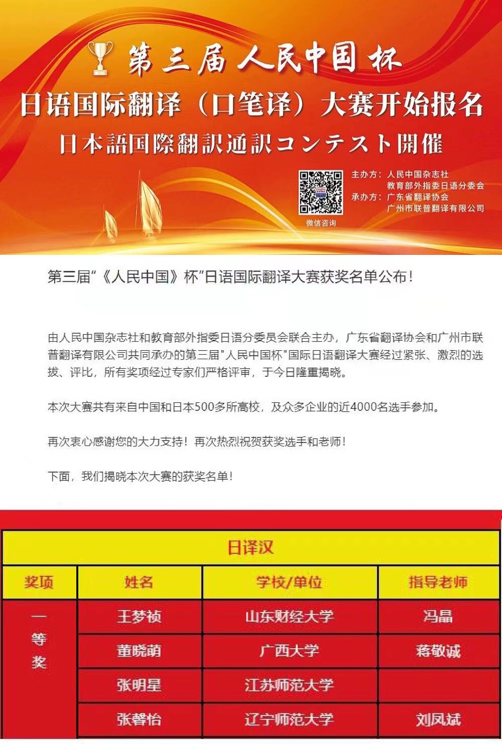 2020年11月27日,由中国外文局《人民中国》杂志社和教育部外指委日语分委员会联合主办的第三届“人民中国杯”日语国际翻译大赛的所有奖项隆重揭晓。在研究生组日译汉的比赛中,探花 日语系4名研究生凭借出色的语言运用能力和过硬的翻译功底取得了优异成绩。其中,2020级研究生王梦祯荣获一等奖第一名,2020级研究生郑欣楠、张东海和2019级研究生郑盼盼同获三等奖(指导教师:冯晶)。