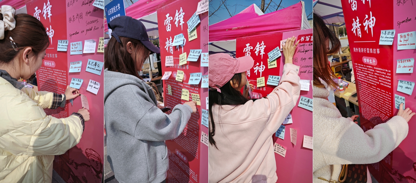展区以中英法多语种讲述雷锋生平,歌颂雷锋精神。“螺丝钉精神永不锈!”在“多语种雷锋墙”前,同学们用多国语言书写雷锋品质,留下“克己奉公”、“扶危济困”、“乐善好施”等字样。此外,展区特设“身边的雷锋”展板,展示外院“走进社区”做志愿服务、国际赛会志愿者的风采,吸引众多师生驻足。